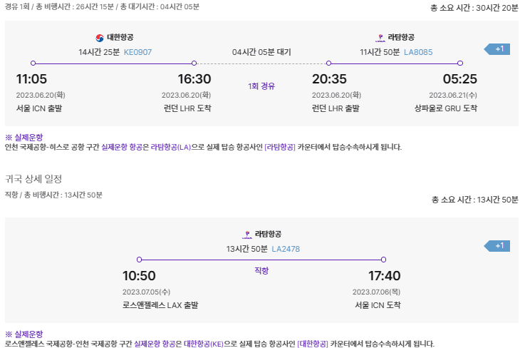 * 브라질 직항은 없고 런던을 경우하는 항공편입니다. 시간이 대기시간 포함해서 30시간이 넘습니다.